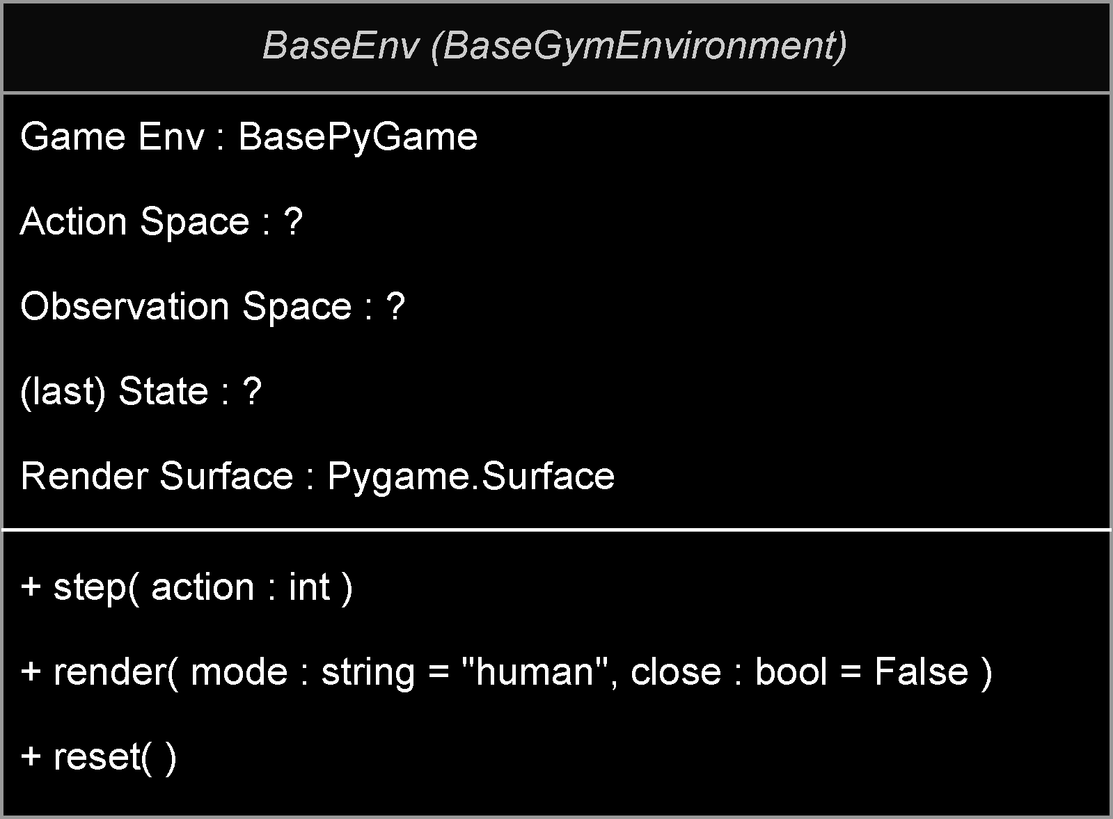 Next up was to implement a Base Gym Environment, I know I must implement the 2 methods mentioned in the previous post plus an additional method to render the environment. However, I was unsure how to go about implementing the PyGame aspect. Should I implement PyGame as part of the Base Gym Environment or should I make a Base pyGame class and pass it into the Base Gym Environment?