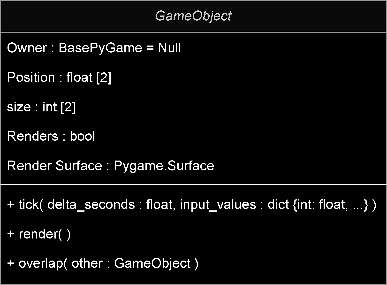 GameObjecttick, render and overlap. Tick is called every frame to update the object, while render updates texture is necessary returning it to be blit-ed to the screen. Overlap on the other hand is used to calculate if two GameObjects are overlapping [Fig. 3].