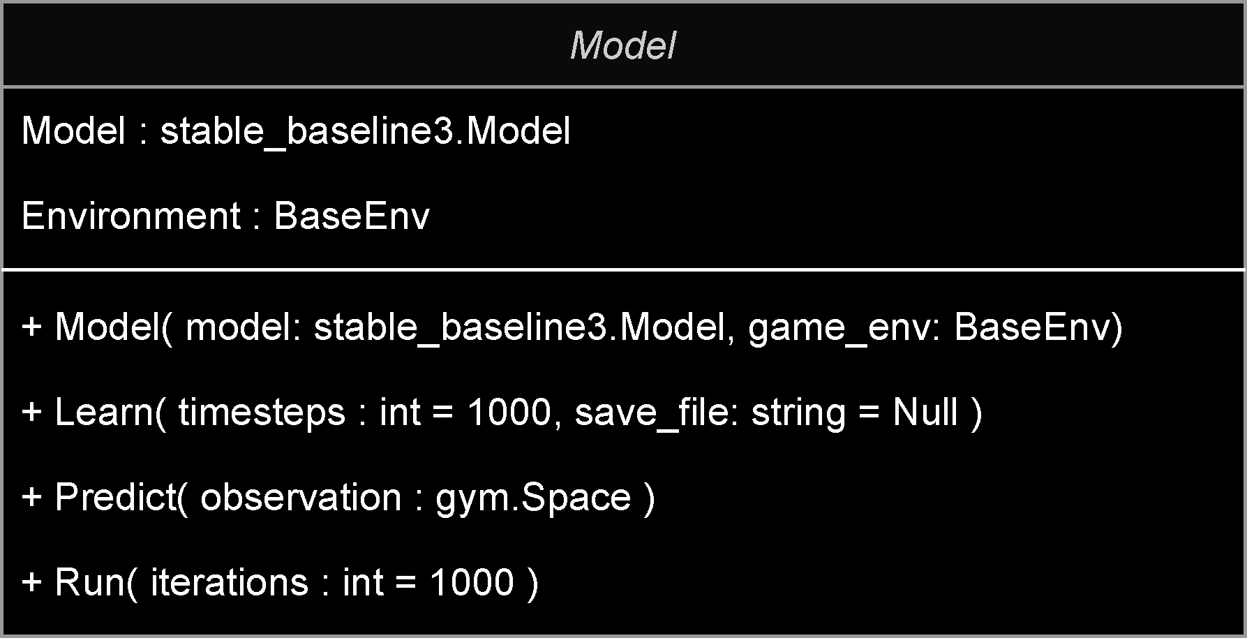 I started with making a simple wrapper class for the stable_baseline3 ML Models which is constructed along with the OpenAi Environment then stable_baseline3 models passed in as parameters. Then i implemented three different methods, to either extend or simplify the default behaviour to better suit my needs. This includes a learn method, witch simply starts the learning process with an added line of code to optionally save the model for later use once complete. Then there the predict method that just returns the predicted action base on the current observation, unlike the default behaviour of the stable_baseline3 model predict method which returns the predicted action and next state; however we don’t have a use for the next state so we discard it. Finally, the run method, which is used to evaluate the trained model by ticking the OpenAi Gym environment for n amount of iterations or until the environment is completed (either from success or death) [Fig. 1].
