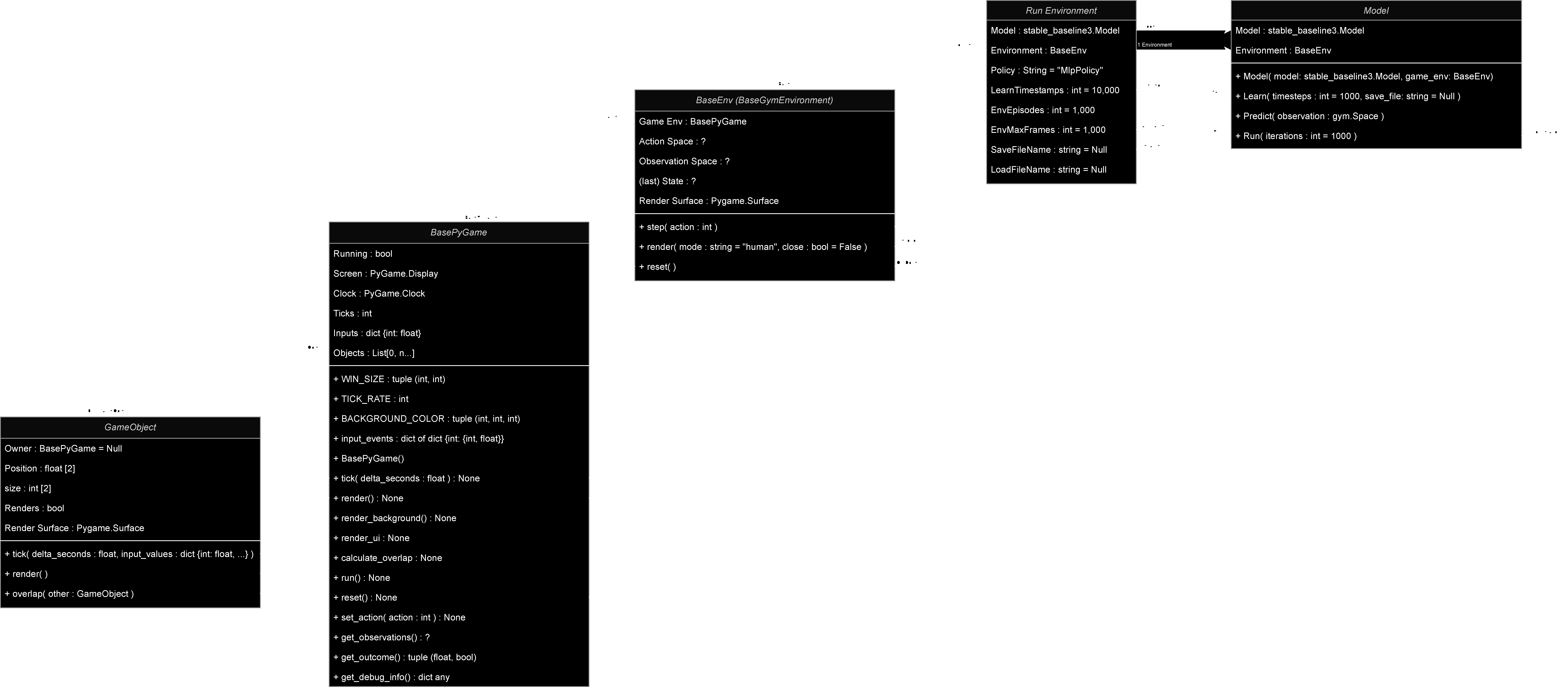 Now it should just be a case of creating a pyGame passing that into the Gym Environment on construction, then passing that into the Model object along with the stable_baseline3 model of our choosing. We end up with an application structure as depicted in [Fig. 5], however I am yet to implement a game and figure out how to map the Ai Gym action and observation space to the environment along with how to define the rewards.