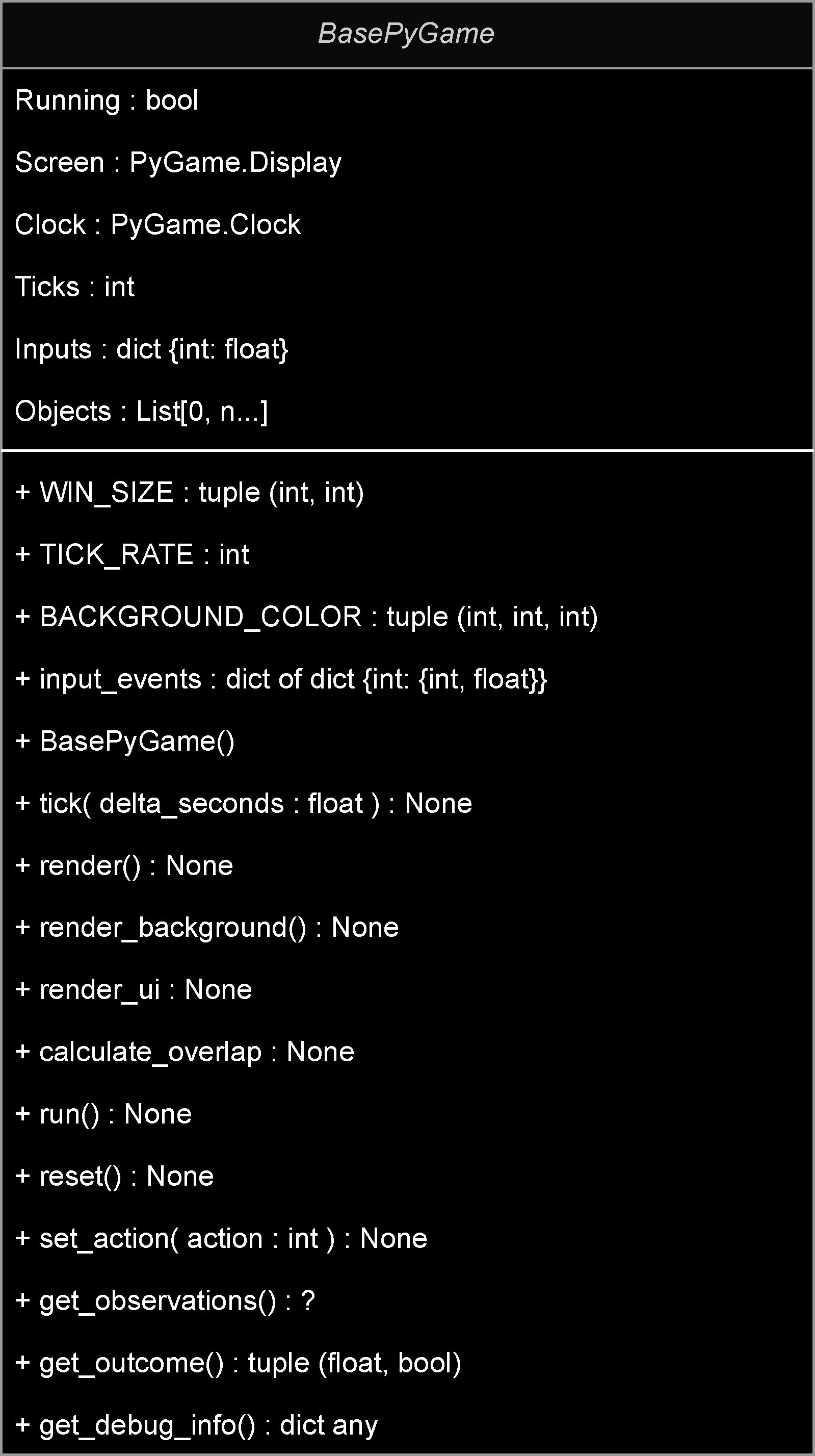 BasePyGame is responsible for handling the game environment, with methods for defining the basic PyGame configuration, including Window size, Tick rate and Input Events.