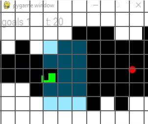 So now it was time to see if it could learn to avoid the obstacle cells. Therefore, I set it off to learn for 175,000 timesteps using DQN. To be far, it done quite a good job at avoiding the obstacle cells and it seemed to be getting the hang of collecting the goals [fig.6].
